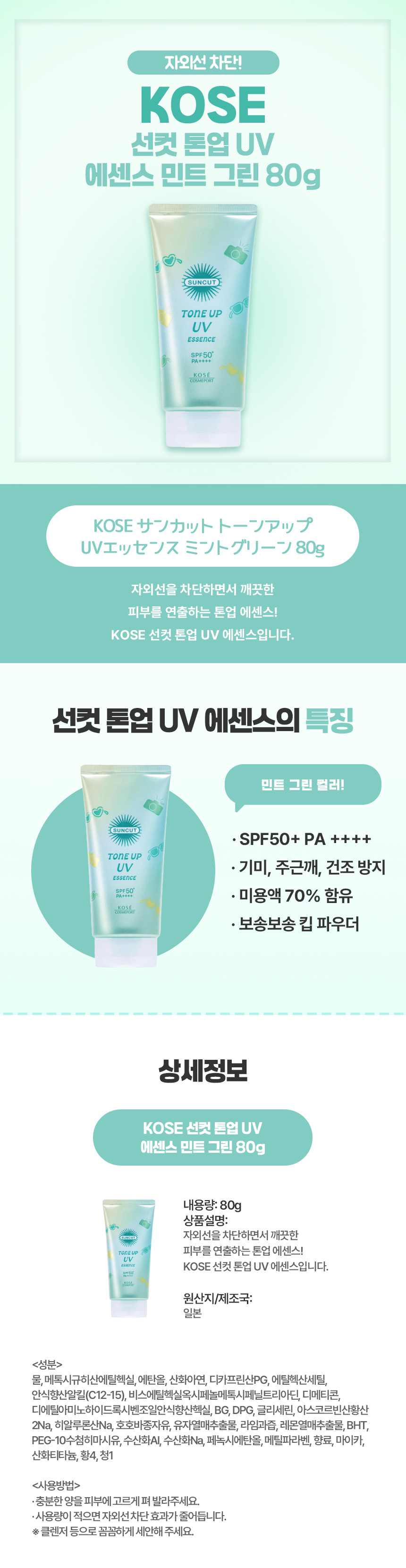 KOSE 선컷 톤업 UV 에센스 민트 그린 80g