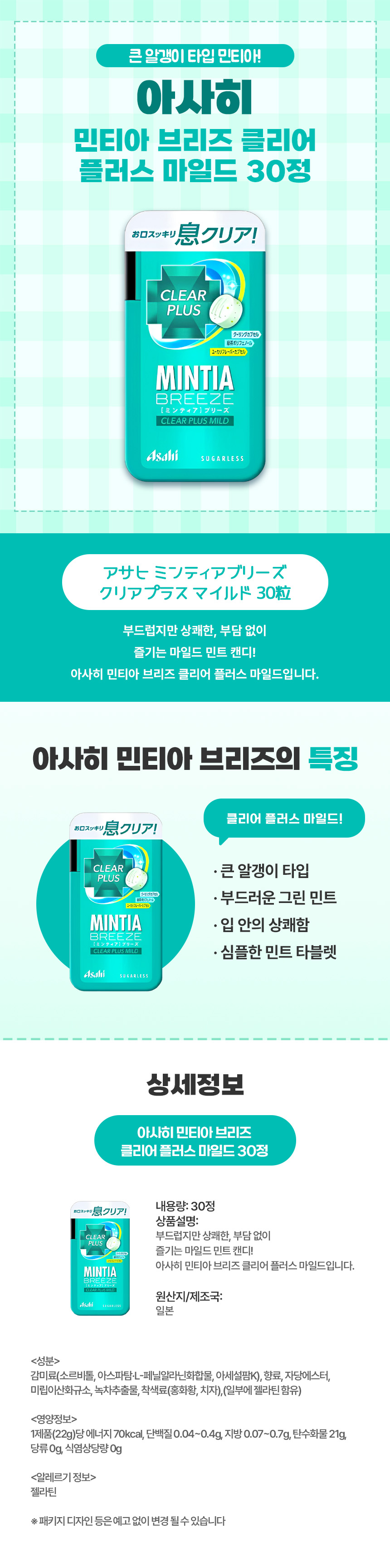부드럽고 은은하게 퍼지는 청량감, 아사히 민티아 브리즈 클리어 플러스 마일드 30정