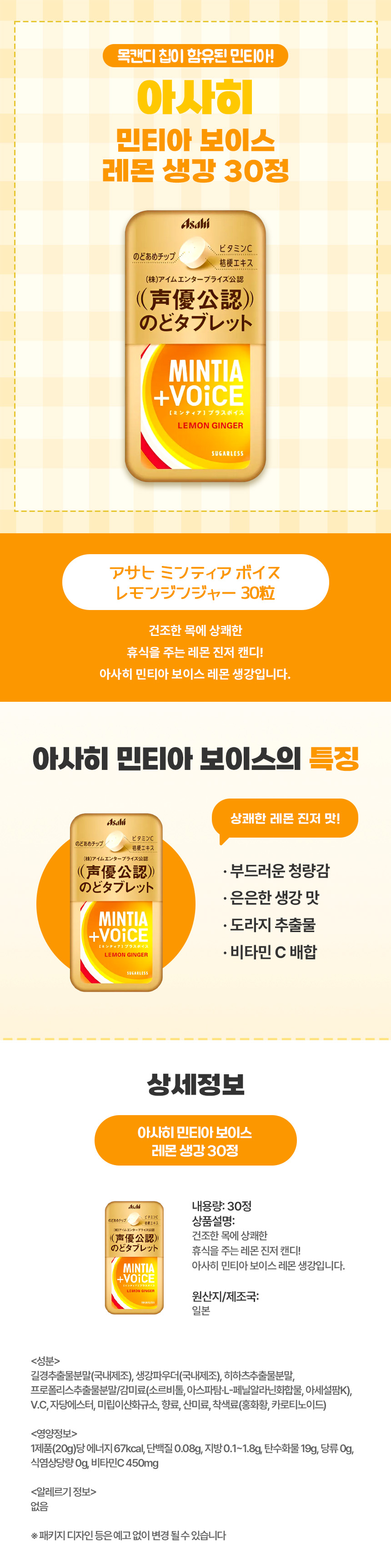 목을 부드럽게 감싸는 생강과 상큼한 레몬의 조화, 아사히 민티아 보이스 레몬 생강 30정
