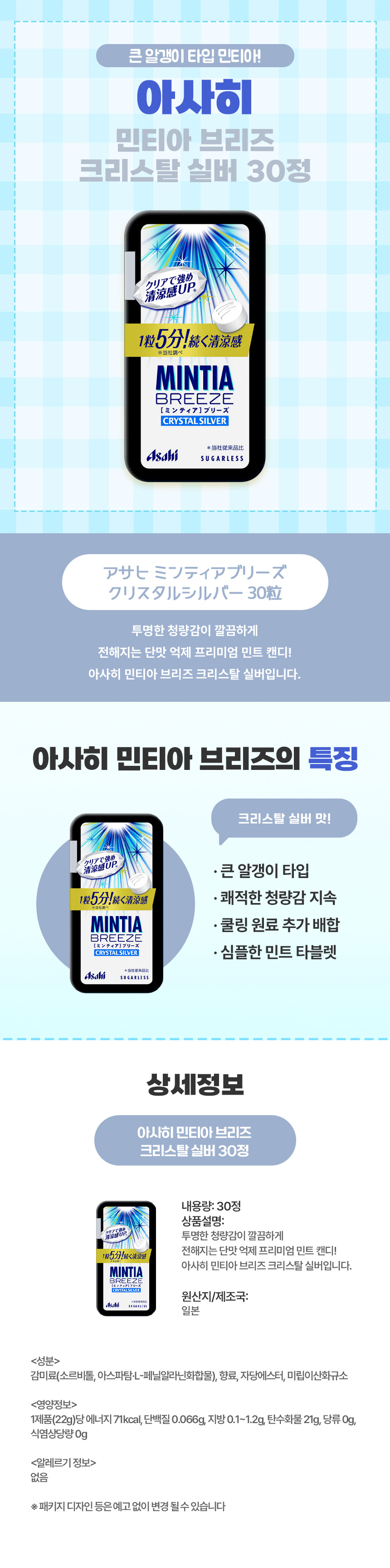 맑고 깨끗한 쿨링감이 입 안 가득 퍼지는, 아사히 민티아 브리즈 크리스탈 실버 30정