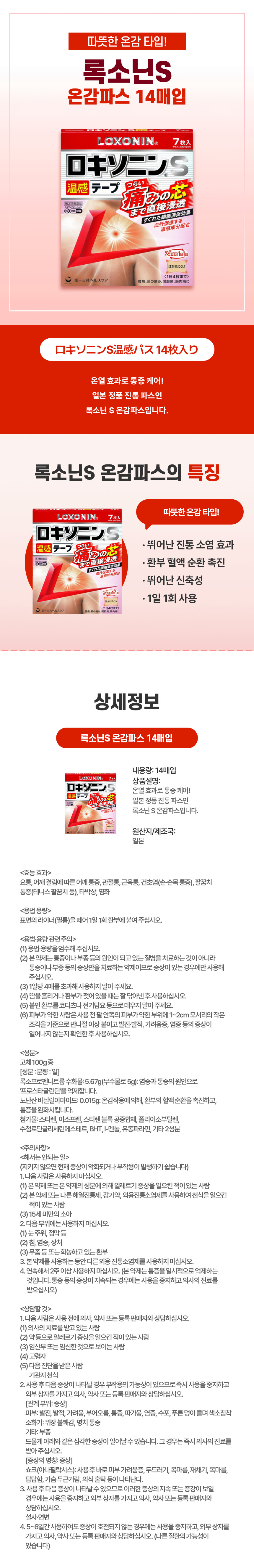 온열 효과로 통증 완화! 록소닌 S 온감 파스 14매입, 일본 직수입 진통 파스