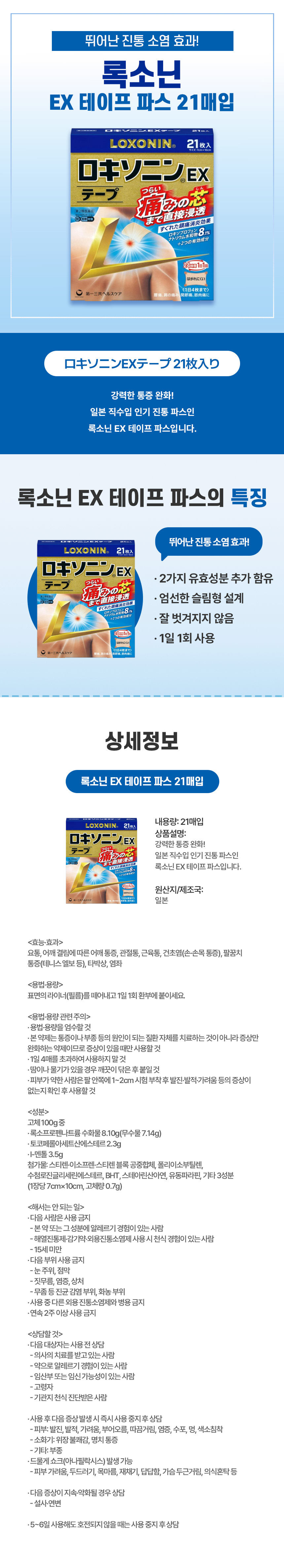 강력한 통증 완화! 록소닌 EX 테이프 파스 21매입, 일본 직수입 인기 진통 파스